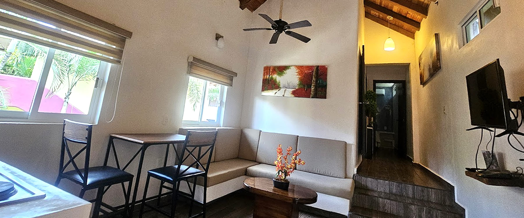 Garden view suite and privately located, this suite will make you want to come back, it offers custom finishes, kitchen área with Air conditioning, wireless internet, hot water,, 1 queen size & 1 full size AND 1 doble bed privacy Good for up to 6 guests.